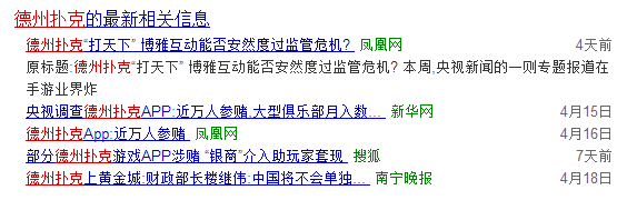 在搜索引擎上搜索德州扑克,最近的消息也大多与“赌”有关,随着德州类游戏涉赌案件的增多,因此也成为相关部门的重点打击对象。