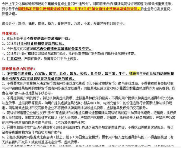 有消息称,文化和旅游部召集部分重点企业召开“通气会”,要求各平台即日起不得提供德州类游戏的下载,并于6月1日前全面终止的德州类游戏的运营。