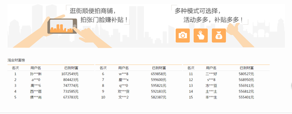 地图淘金是百度官方推出的一款社会化众包APP,用户通过完成百度指定区域的商户门脸拍摄任务,获得奖励。