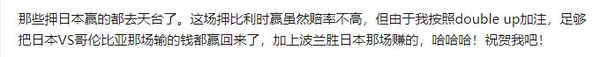 按照他的理论,反正日本队在世界杯夺冠的可能性非常低,那么就一路押日本输球,一次不中下次翻倍,反正日本不大可能赢得世界杯嘛,那么日本最终一定会输一次。